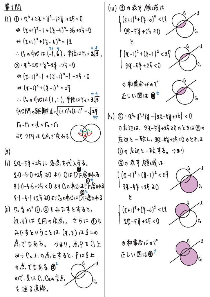 第1問は図形と方程式の問題でした。円を中心とした問題で、絶対値つきの不等式の領域がややこしい。