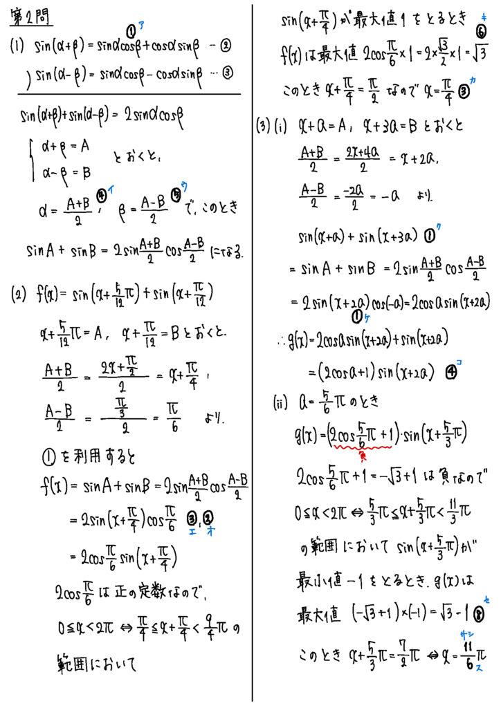 第2問は三角関数。和積の公式を用いた出題で、あまり馴染みのない人には辛かったかもしれませんが、出来上がった公式に当てはめていけば一応進むかな。