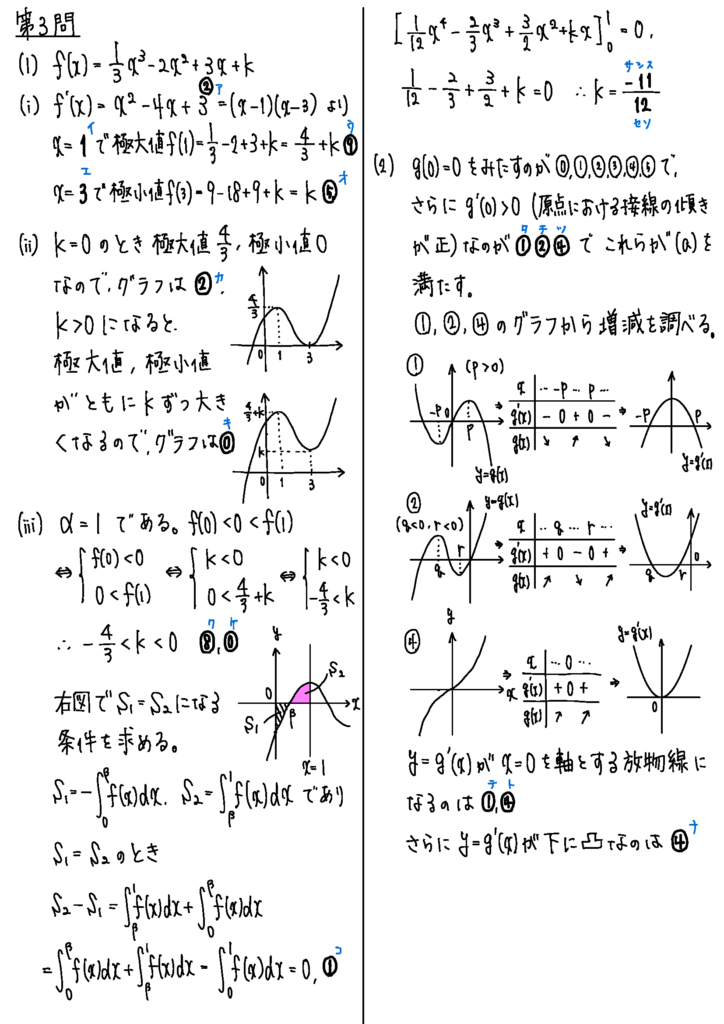 第3問は微分・積分。グラフから導関数を形を考える問題は、二階微分を使って変曲点が0になるという方法が速そうですが、文系の範囲内の解答にしてみました。