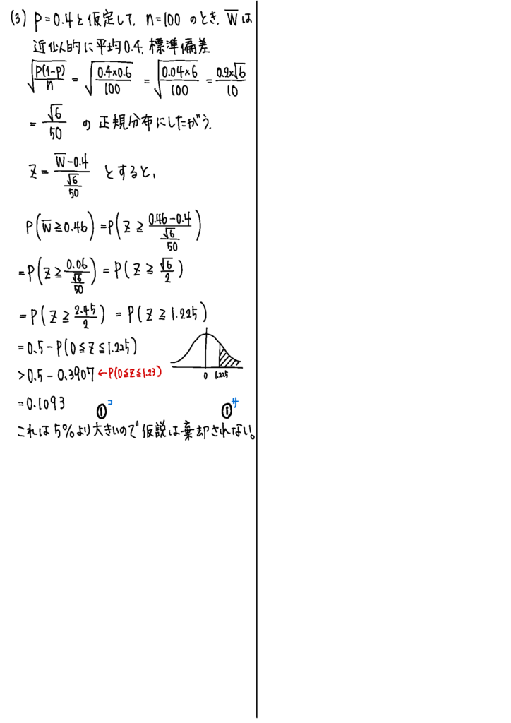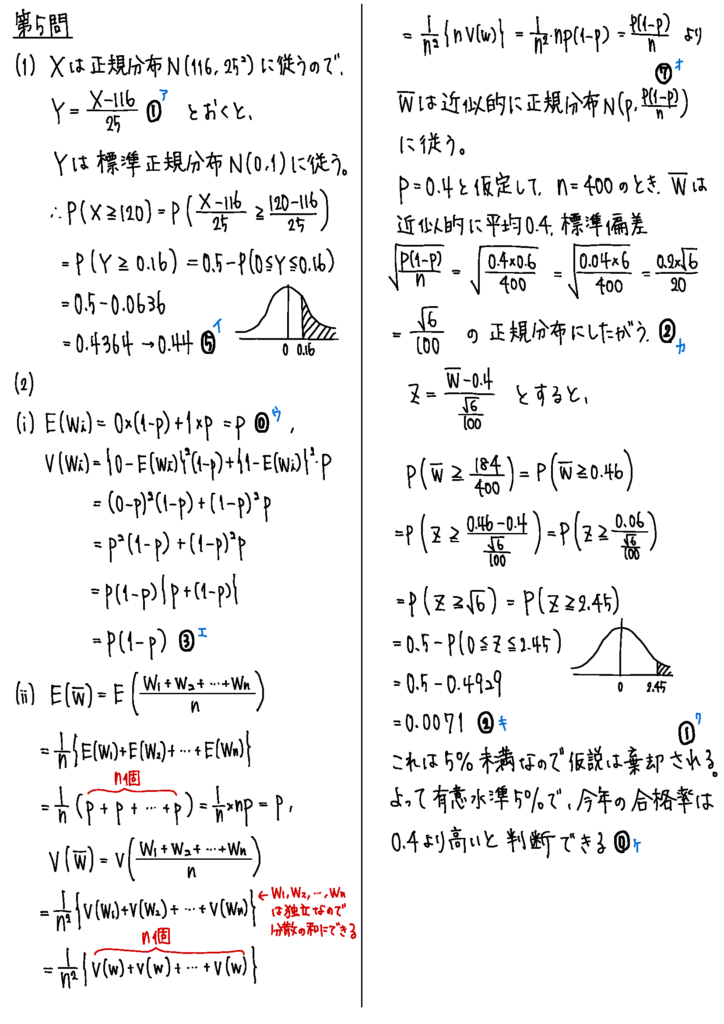 第5問は統計的推測。そもそもこの単元は問題のパターンが限定的なので、例年とあまり変わらない感じ。新課程になってからは仮説検定が必ずと言っていいほど最後に出てくるね。