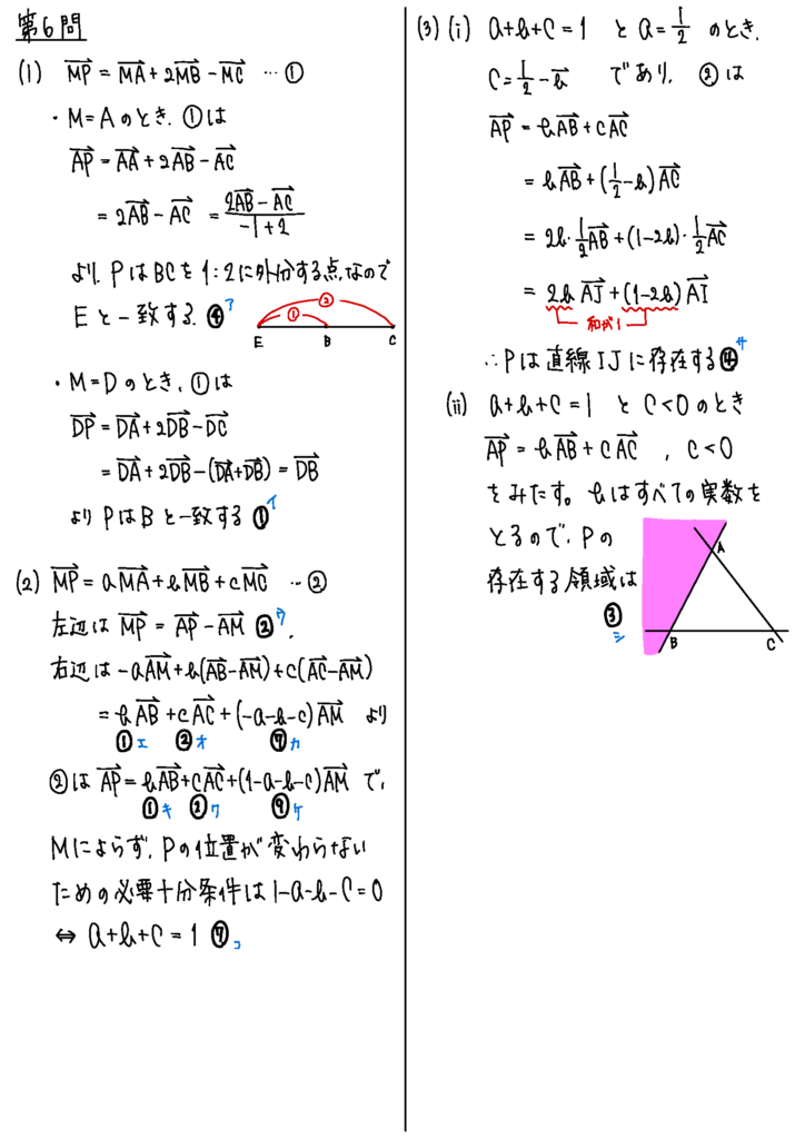 第6問はベクトル。正六角形を用いた問題ですが、あまり図形は利用せずに計算中心にしてみました。点の存在範囲問題はめずらしいかも。
