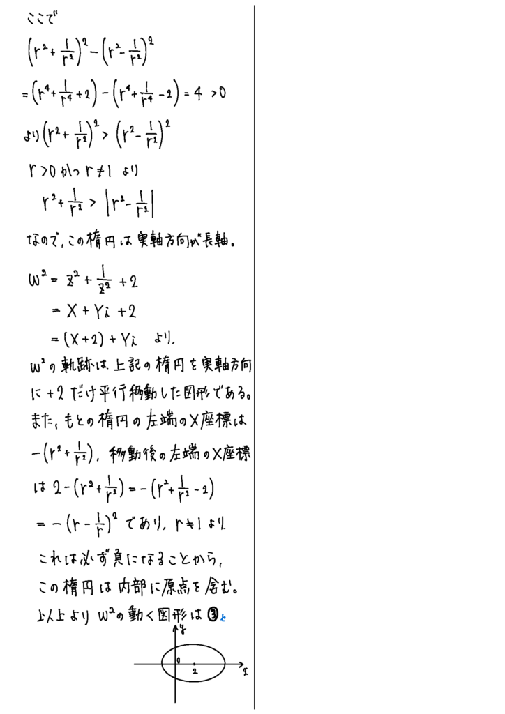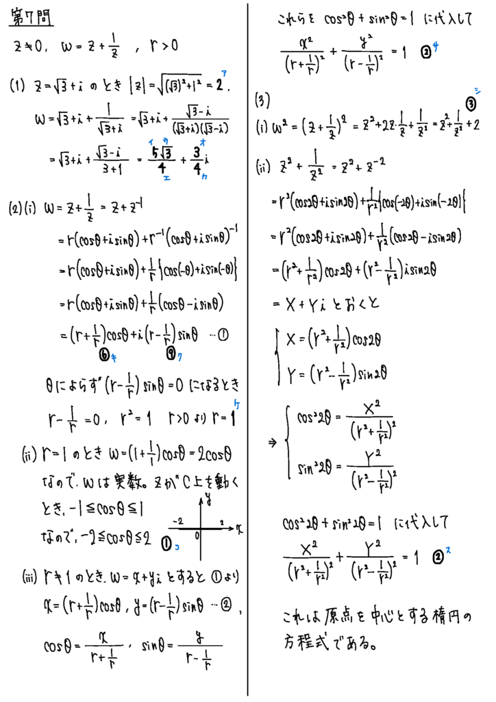 第7問は複素数平面と2次曲線。両方の単元を入れるとなると、複素数平面上に楕円やら何やらを描かせるパターンが王道になってくるのかもしれないですね。